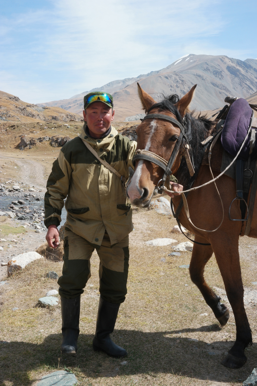 After the Tosor pass (3,901 m), I was riding through a most stunning valley. I had to cross several small rivers. One was quite deep. I was checking where was the best place to cross. Azat, a 33 year old ranger (who is chasing wolves to save ibexes and yaks), arrived. He immediately gave me his horse and took my bike. He pointed at his long boots. Wonderful! Not only because I didn’t have to cycle through the river but mainly because I could ride his beautiful horse. He accompanied me to the next tricky road and showed me the detour I had to take. A most friendly man on a most beautiful day! #kyrgyzstan