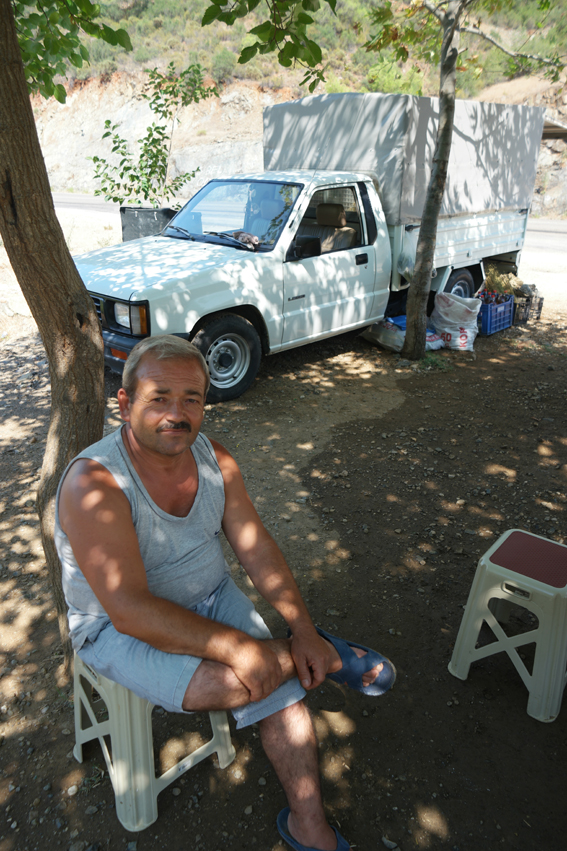 On the mountainroad to Pamukkale it was harsh cycling, temperatures above 40 degrees and a lot of 8-11% climbing. Luckily there were fountains now and then. This sweet man, Mohammed, who has a tea and corn stall, invited me to have a seat, gave me a couple of yellow fluorescent teas and a towel where I could sleep on. He also called somebody who spoke English to ask that person if I was in need of something… He was so great! Thanks for the nice pause Mohammed! #Turkey
