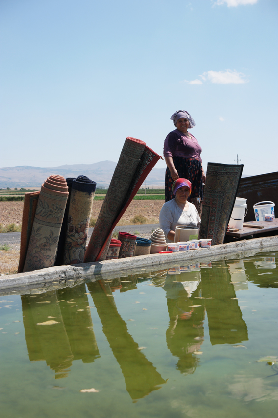I was interested in the sunflower field next to the working place of the ladies (they were standing on a truck while cleaning carpets). The sunflowers were covered in colorful plastic bags, to catch the seeds. I asked to take a picture of the sunflowers. Suddenly I was offered lots of yummy watermelon and a bag full of organic tomatoes and cucumber #Turkey
