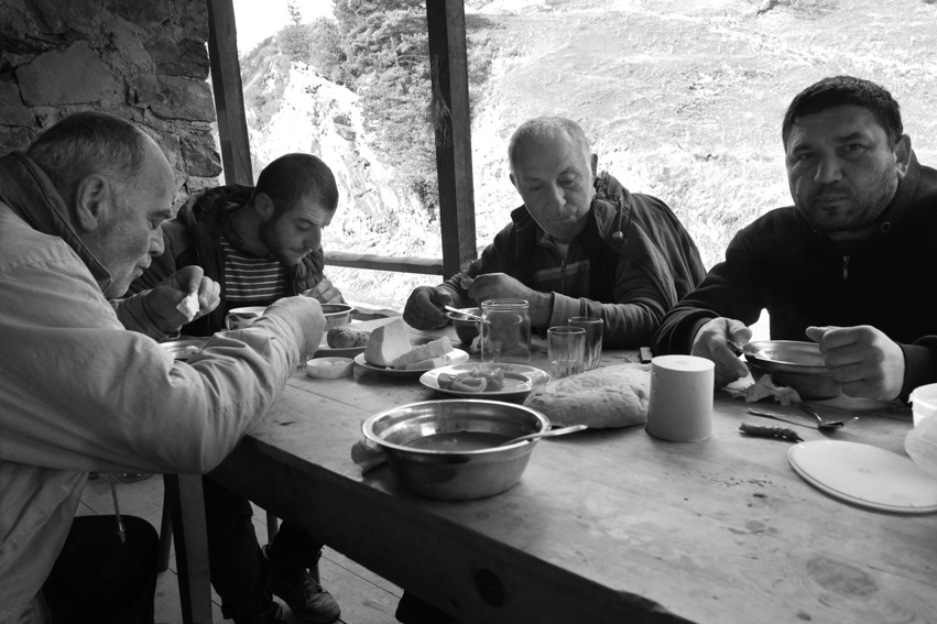 Going down from the Abano pass to Omalo was due to sunset a wonderful experience. Some roadworkers informed me that the last 30 kilometer stretch to Omalo was a constantly going up and down. I realised I couldn’t make it before dark. I saw a guesthouse, at least, that was what I thought. Actually it was a house where four woodworkers were living and enjoying beer and chacha. They offered me beer too and chacha, soup, bread, apples and a night stay. Perfect timing… Thank you guys! #Georgia