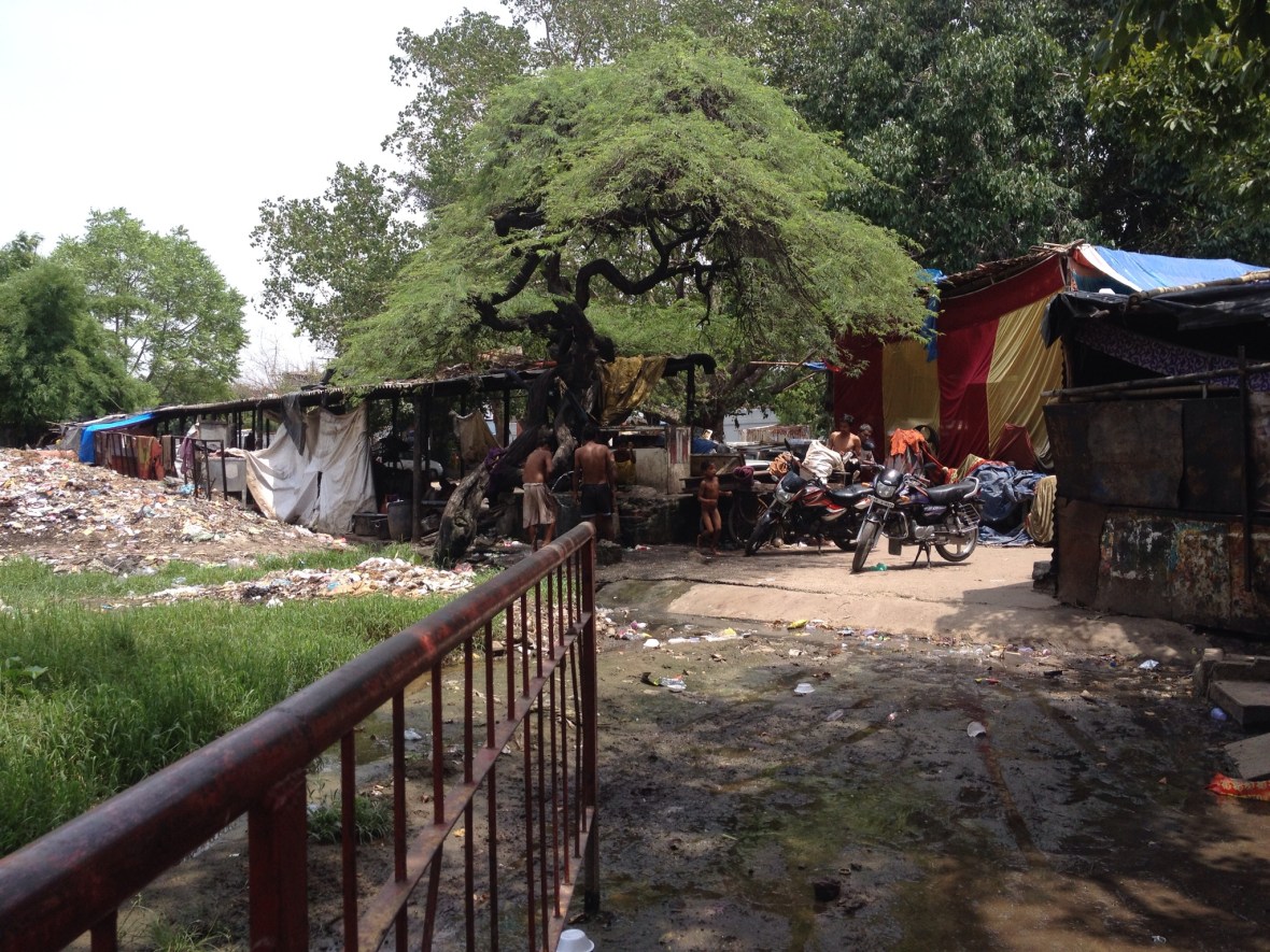 14 August 2014 2048 × 1536 Storthoop, woonbarakken en kindjes die zich wassen onder straaltje water. Nog geen kleine kilometer verder de wit marmeren Lotus Tempel. Contrast!